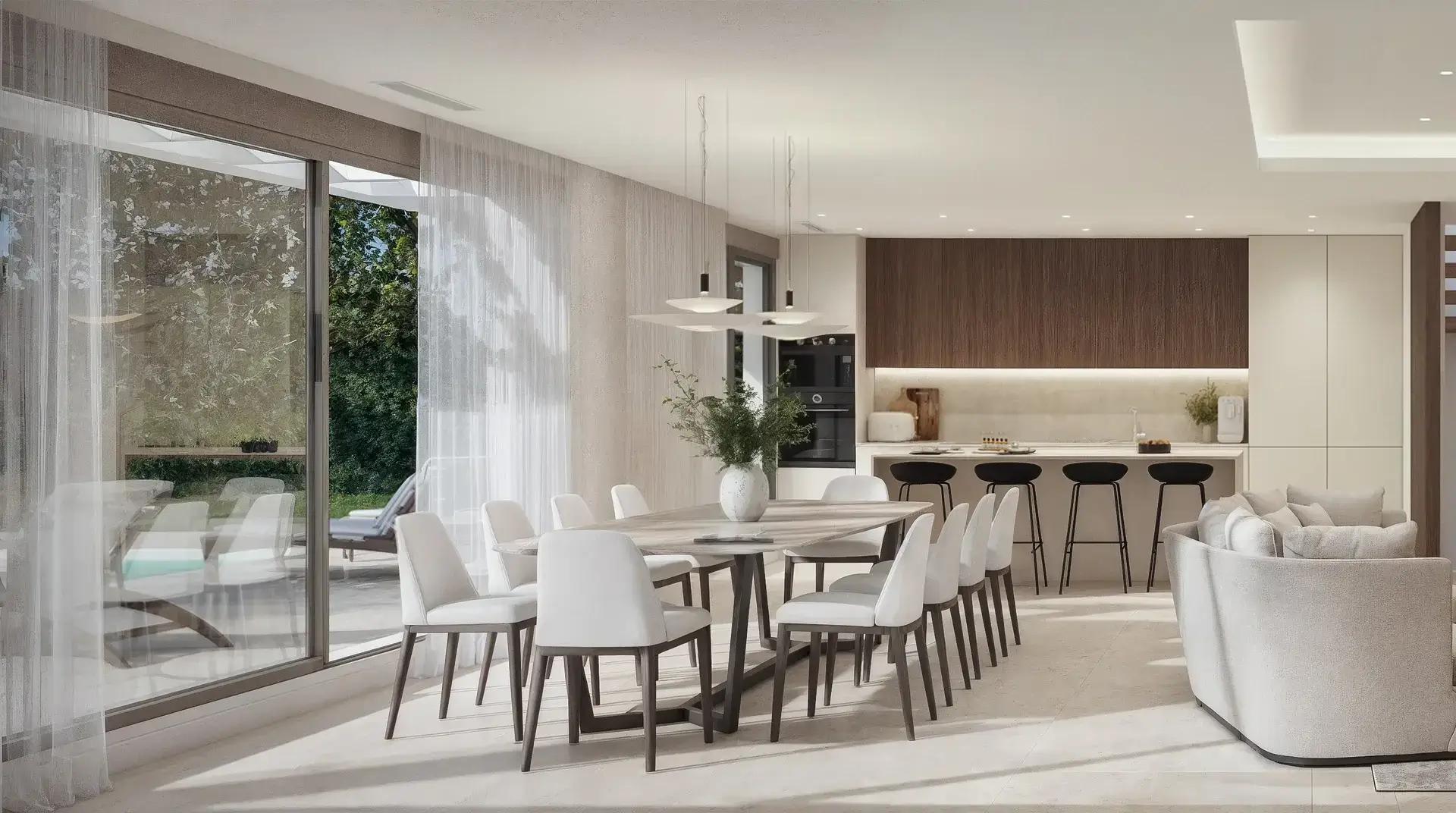 • Salón con grandes ventanales y acceso directo al porche y al jardín